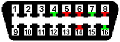 | Pin 4 - Chassis Ground Pin 5 - Signal Ground Pin 6 - CAN High (J-2284) Pin 7 - ISO 9141-2 K Line Pin 14 - CAN Low (J-2284) Pin 15 - ISO 9141-2 L Line (!missing!) Pin 16 - Battery Power (+12V) |